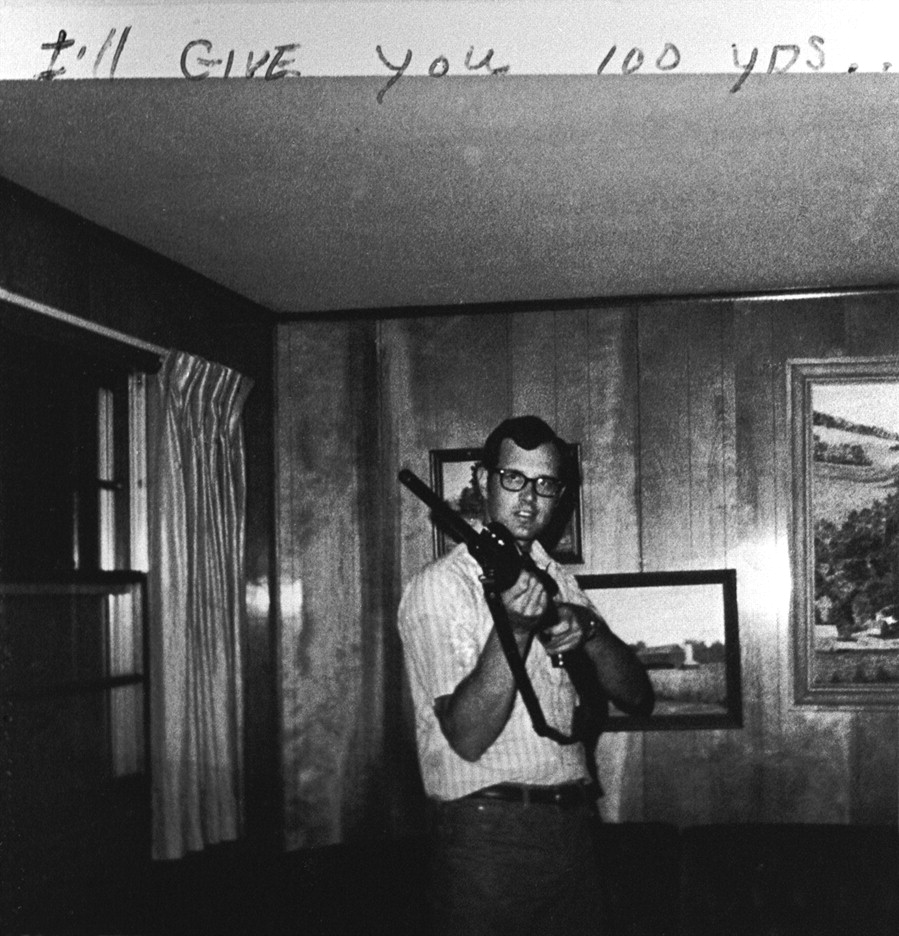 FIGURE 2 A picture of the gunman, James Huberty, before the massacre. Note Huberty's handwritten message on the photograph, "I'll give you 100 yds." Photograph courtesy of Dave Gatley. All rights reserved.