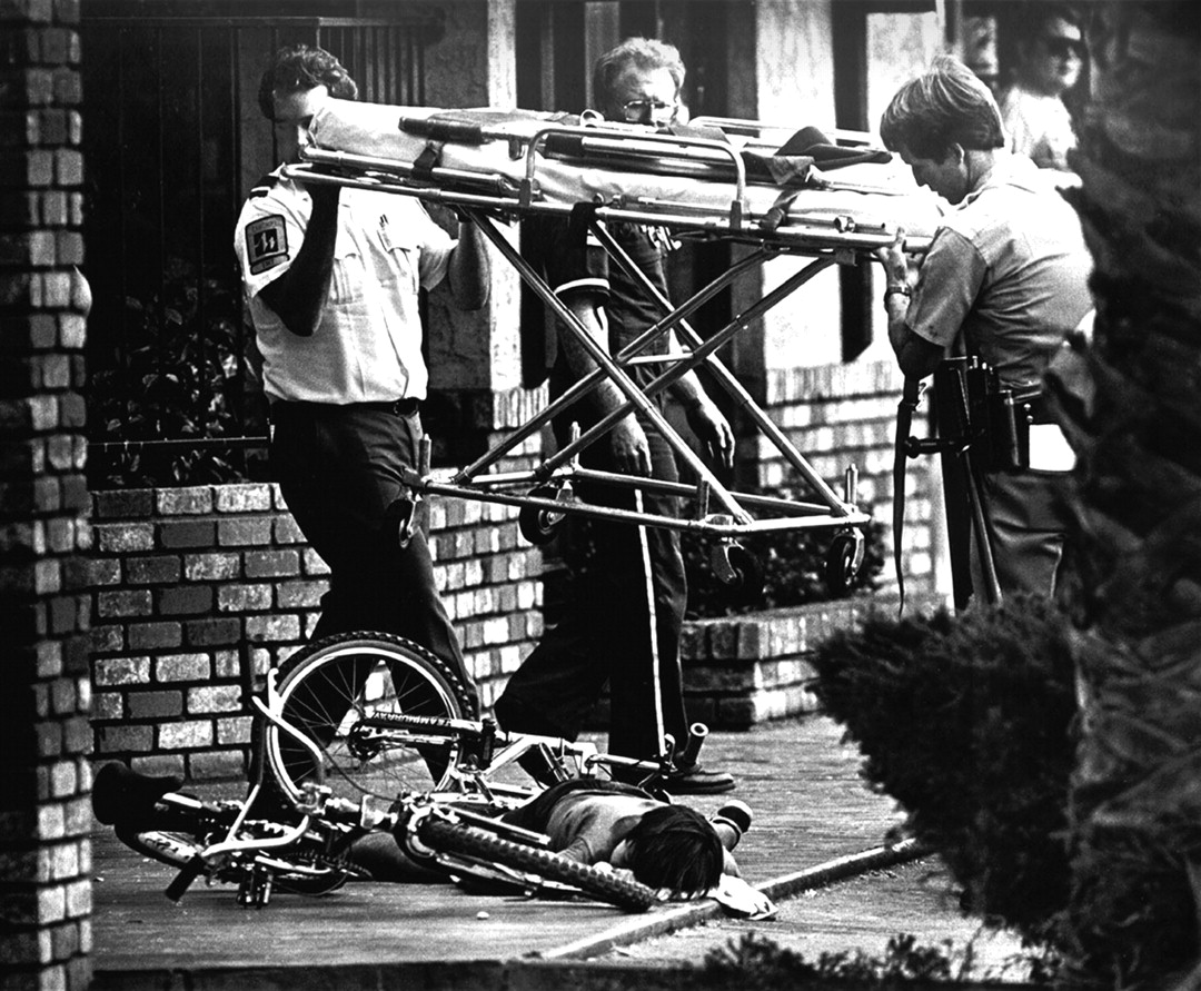 FIGURE 4 Emergency personnel arriving on the scene of the McDonald's massacre, July 18, 1984. Photograph courtesy of Dave Gatley. All rights reserved.