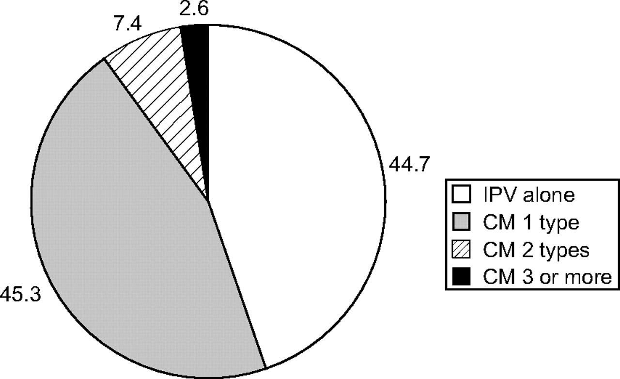 FIGURE 1 Percent of homes with IPV reporting one or more types of CM (n = 1,232, weighted n = 554,194).