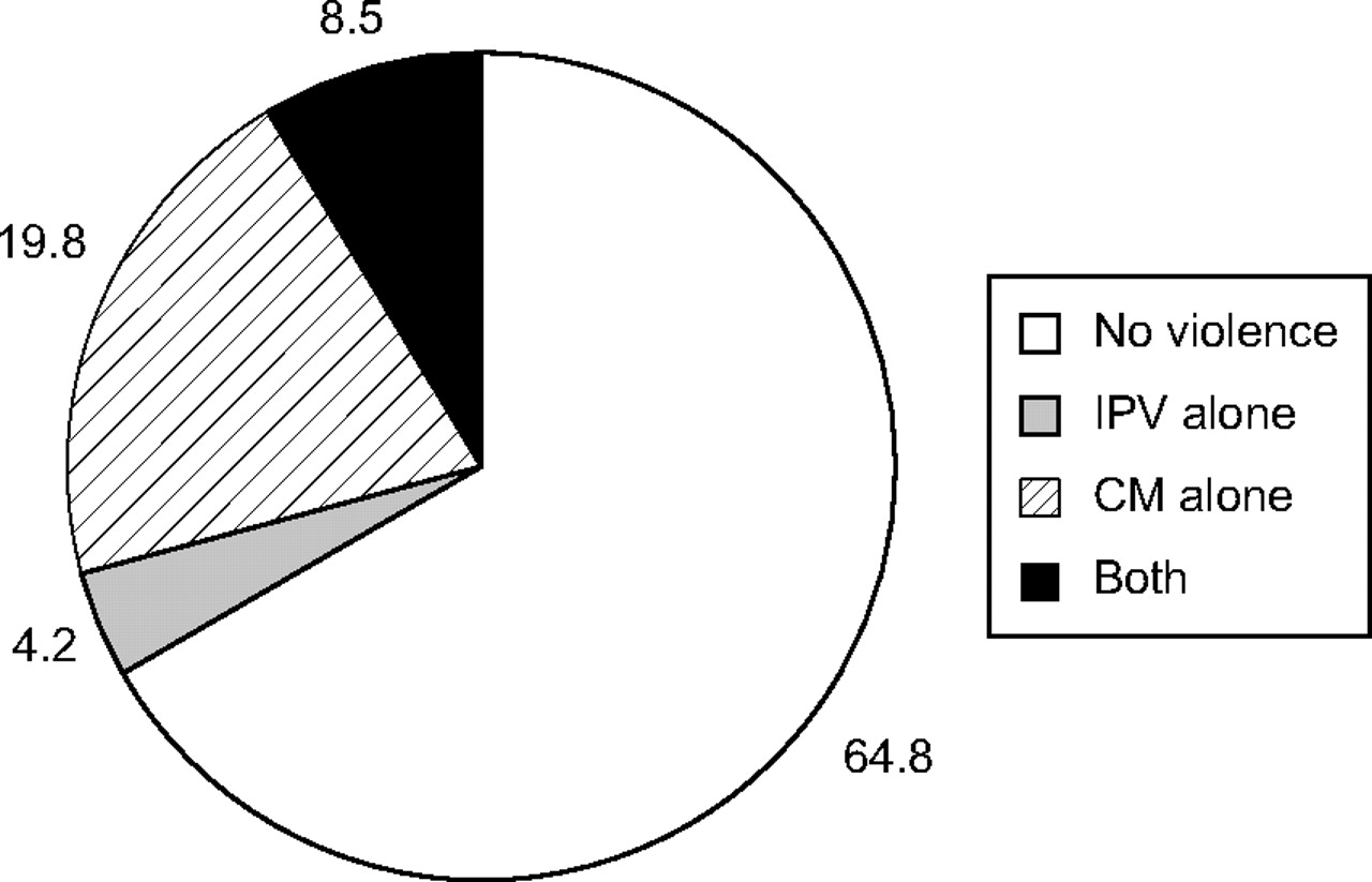FIGURE 2 Percent of homes reporting IPV alone, CM alone, both, or neither (n = 1,232, weighted n = 554,194).