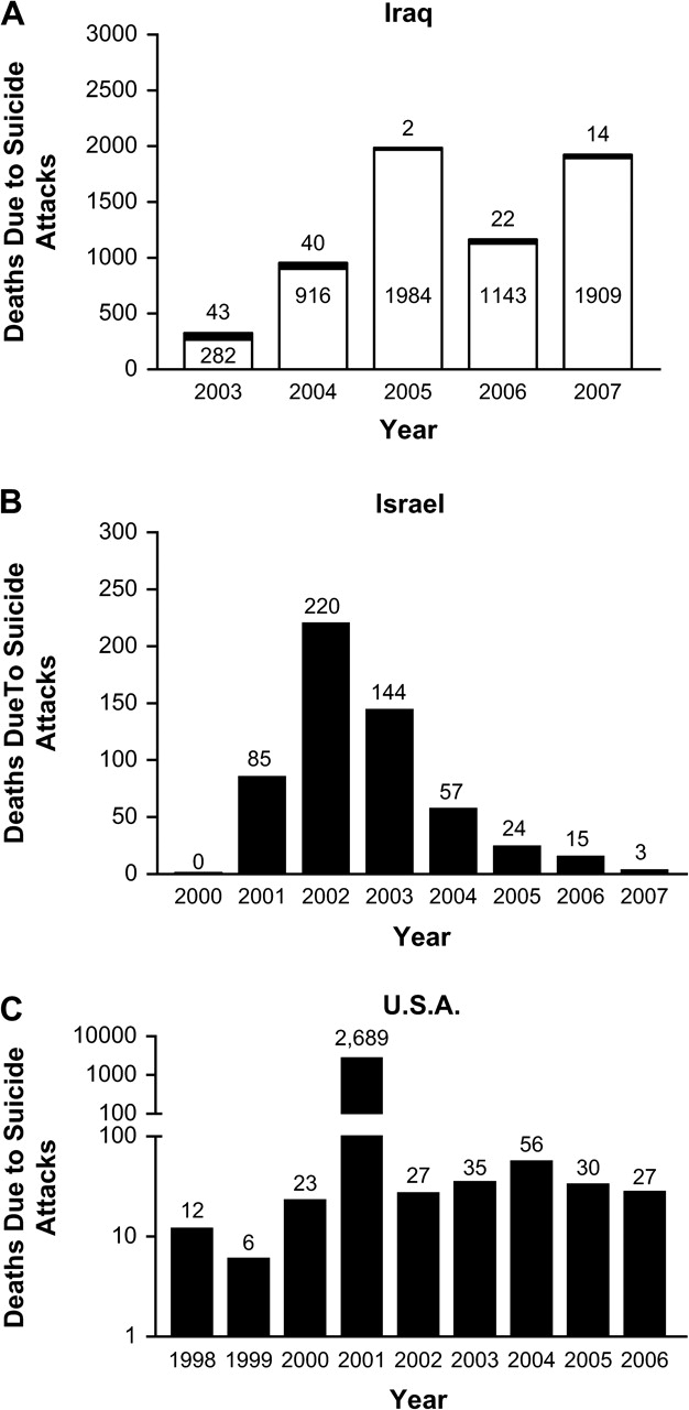FIGURE 1 Country case studies of suicide bombing victims. (A) Figures based on newswire reports as of June 1, 2007. Lower number represents total Muslim victims, top number represents total non-Muslim victims. (B) Figures based on a 2006 report by the Institute for Counter Terrorism. (C) Figures based on the U.S. State Department's Country reports on terrorism.