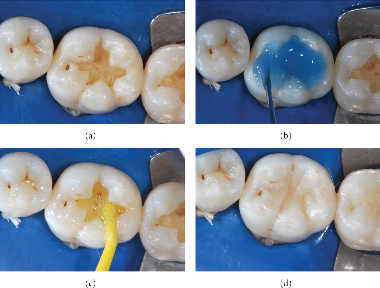 (a) After caries removal, the cavity is prepared to receive the resin-composite restoration. (b) Acid etching treatment with phosphoric acid 37%. (c) Application of a simplified (1 step) adhesive system. (d) After the photoactivation procedure, the resin-composite restoration was built. Adhesive system used: Single-Bond (3MESPE). Resin composite: XRV Ultra (Kerr).