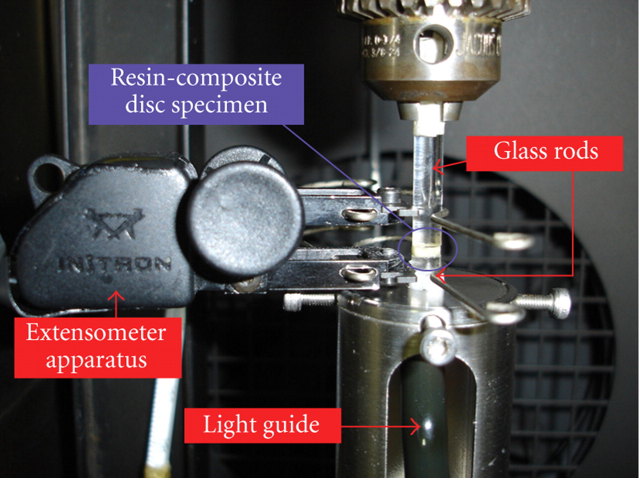 Extensometer apparatus that is connected to a universal testing machine. As a feedback response, the system compensates deformations and the sample remains constant. Consequently, this kind of method is known as a “low-compliant method.” Pictures kindly donated by Dr. Carmen Silvia C. Pfeifer. Equipment is from the School of Dentistry, University of São Paulo (São Paulo, Brazil).