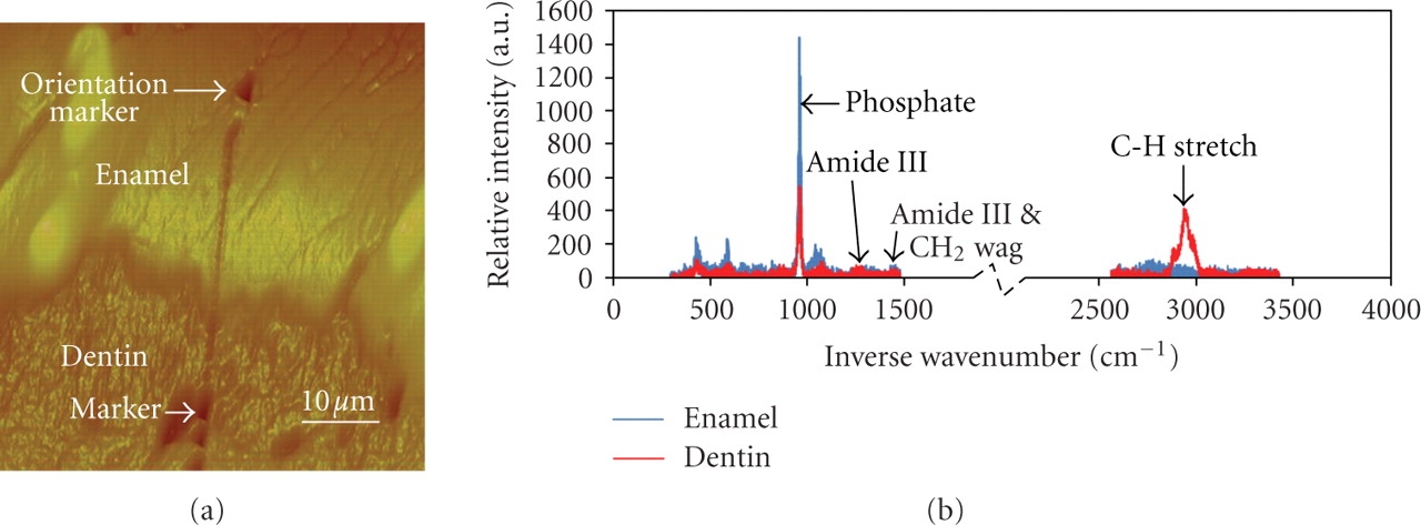 DEJ region. (a) An AFM image showing enamel and dentin with line of indents and orientation markers. (b) Typical spectra for regions of interest from enamel (blue) and dentin (red) near the DEJ.