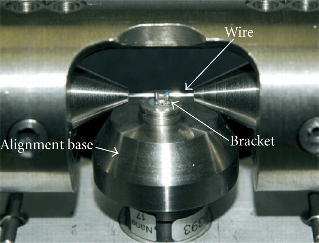 A close-up photograph of the wire held in support dies loading the bracket and load cell.