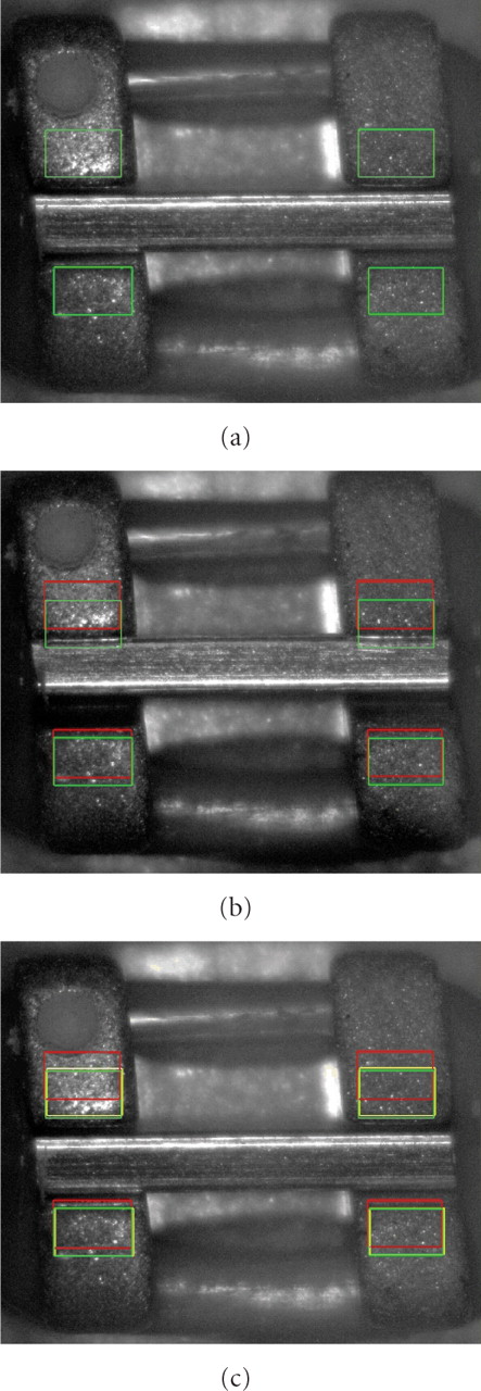 Image of brackets showing the location of tracked regions, (a) the original positions (green box), (b) maximum separation (red box) and (c) final, un-torqued location indicating permanent deformation (yellow box).