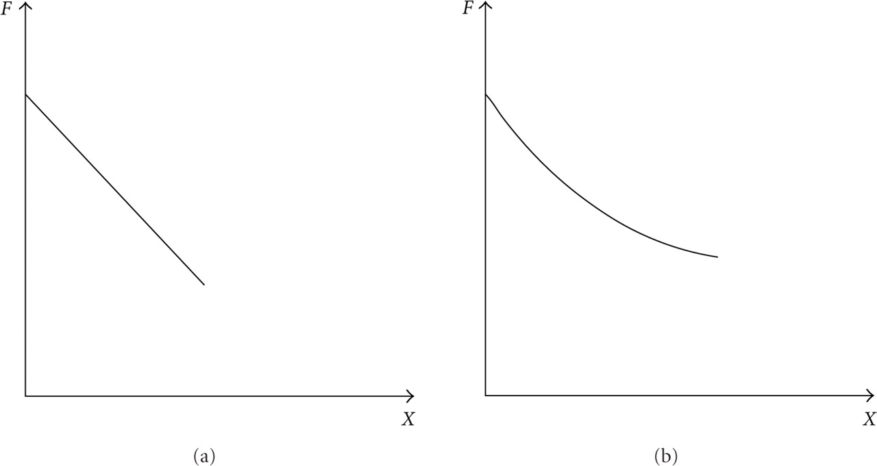 Typical force versus displacement curves for spring-type (a) and magnetic (b) activation methods.