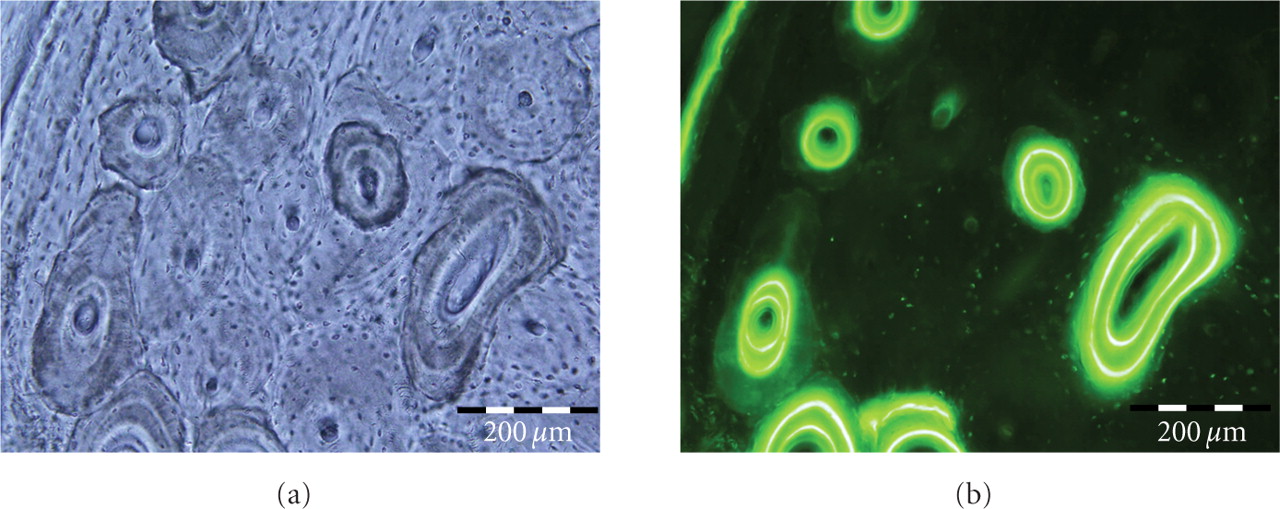 Pair of images (a) Brightfield and (b) Epifluorescent of cortical bone from a dog femur. Osteonal architecture of bone is evident. In addition labeled and unlabeled osteons can be clearly distinguished. The reversal lines and bone labels clearly demarcated the labeled and unlabeled osteons.