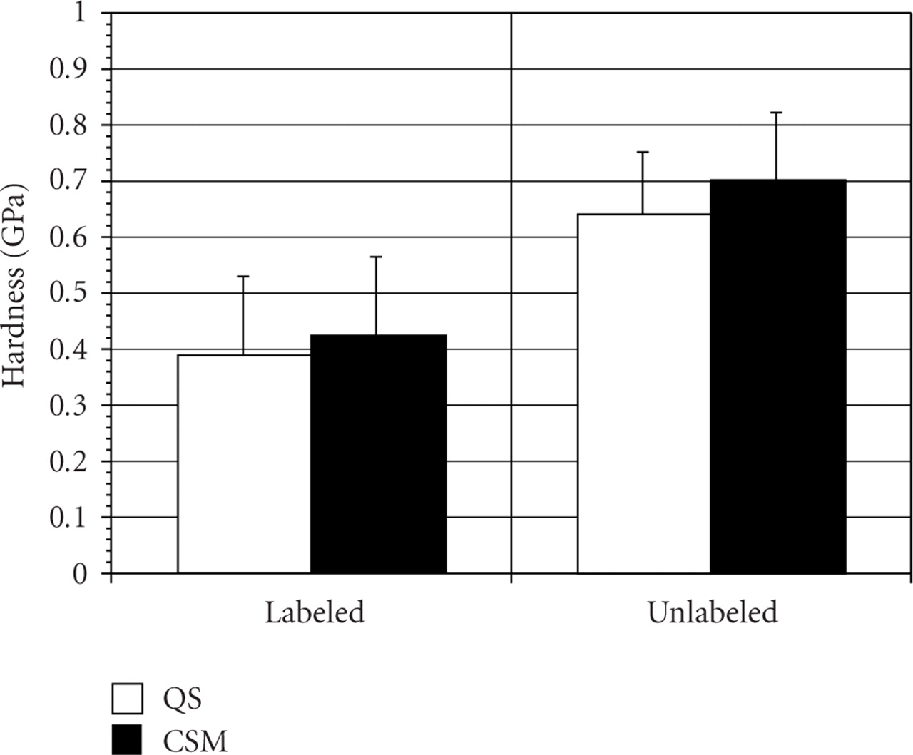 continuous stiffness measurement (CSM). The hardness was not significantly different for the two methods for the labeled (