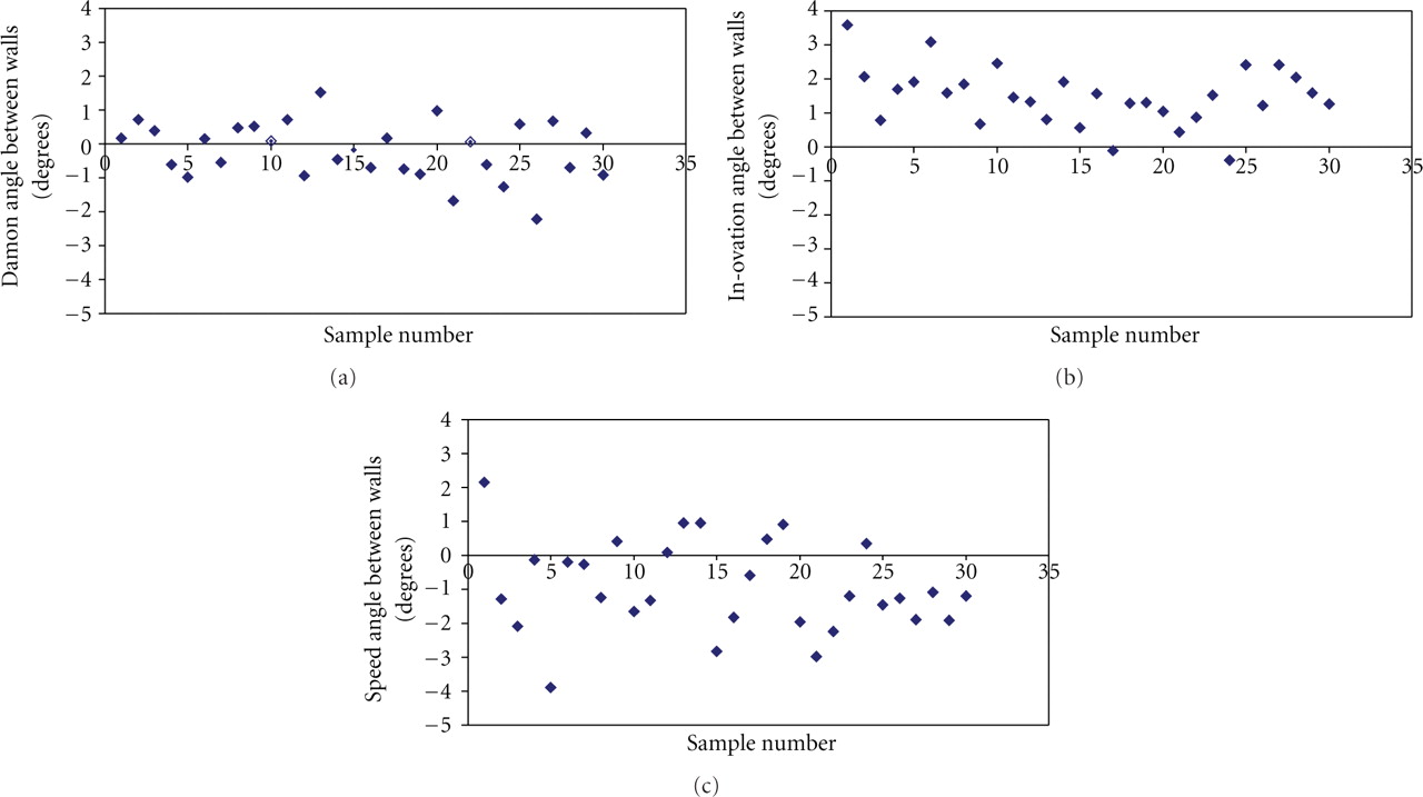 Scatter plots of Damon, Speed, and In-Ovation brackets showing the distribution of data for the difference between measured left and right slot angles: (a) Damon Q bracket, (b) In-Ovation R bracket, and (c) Speed bracket.