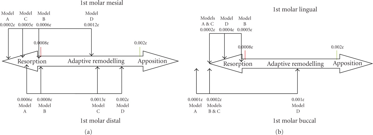 (a) Mesial/distal strains and (b) lingual/buccal strains within in the cortical ridge of the 1st molar in all three cases evaluated with Frost's bone mechanostat (not to scale).