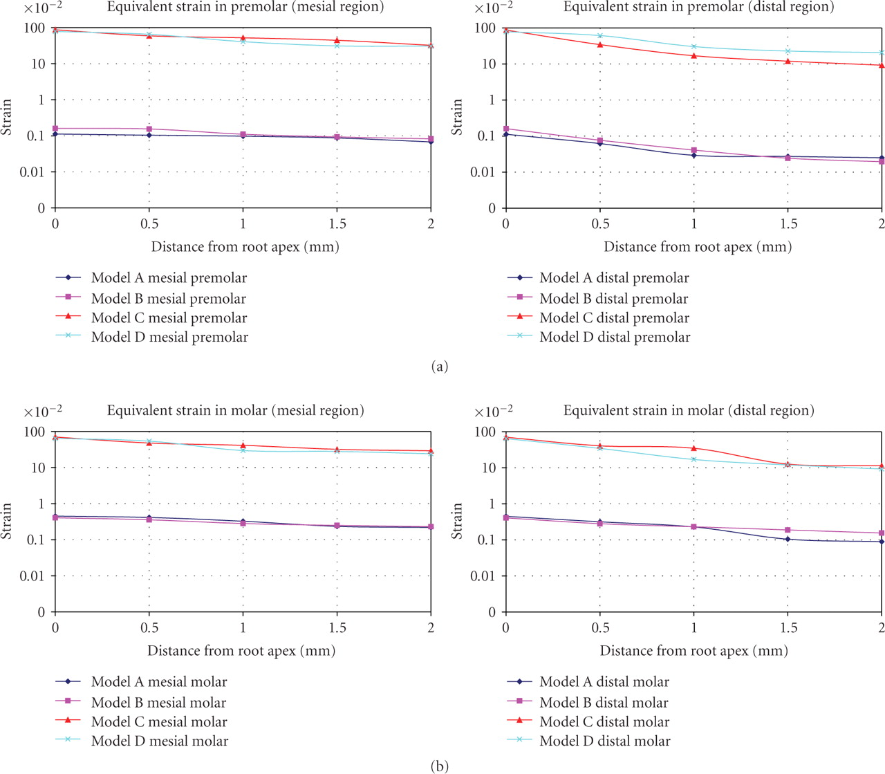 Equivalent strain contours in the PDL (a) premolar and (b) molar.
