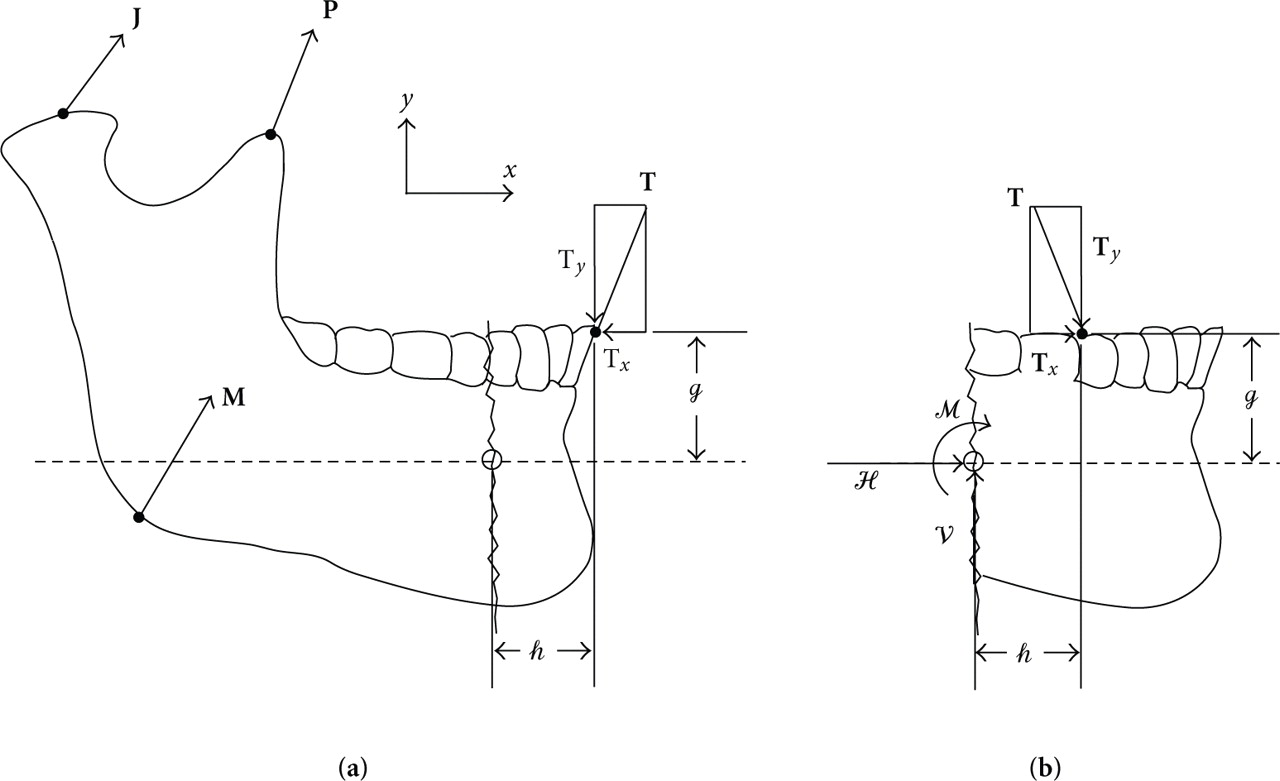 (a) Nonlever model of the mandible illustrating a generic tooth contact, adapted from Katona [24]. The approximation to the centroidal (neutral) axis of the mandible (dashed line) is a distance ℊ below the tooth-tooth contact point. The anterior section of interest is demarcated by horizontal distance ℎ from the tooth contact. (b) FBD (free-body diagram) of the (fractured-off or imaginary) anterior segment.