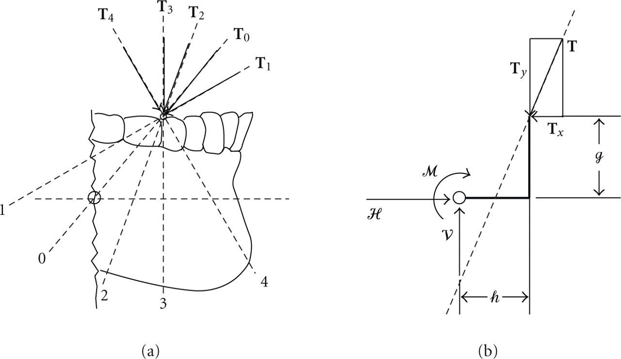 (a) The 5 mechanically distinctive orientations of T defined by relative location (ℊ and ℎ, Figure 2(b)) and cusp contact inclination. T 1, T0, and T2 have posteriorly directed horizontal components. T3 is vertical. T4 has an anterior component. T1 produces a ccw moment about the circle. T0 generates no moment. T2, T3, and T4 generate cw moments. (b) A generic representation of Figures 2(b) and 3(a). Note that a change in the anterior-posterior relative location of bite contact and ◯ is defined by ℎ. Occlusal plane height is given by ℊ.