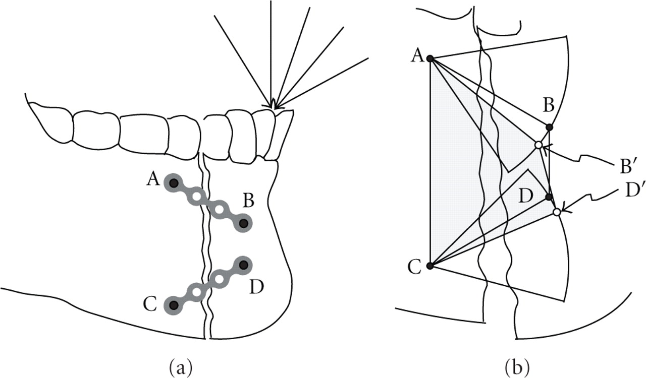 (a) Schematic representation of a fracture repair that forms a trapezoidal 4-bar linkage, ABDC. (b) The plate-constrained displacement, BD → B′D′, of the anterior segment.