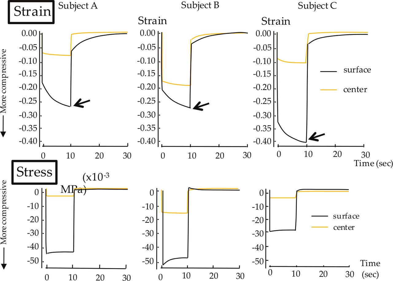 The minimum third principal (compressive) strain and stress at the surface and center of the mucosa throughout the loading and unloading periods for each subject.
