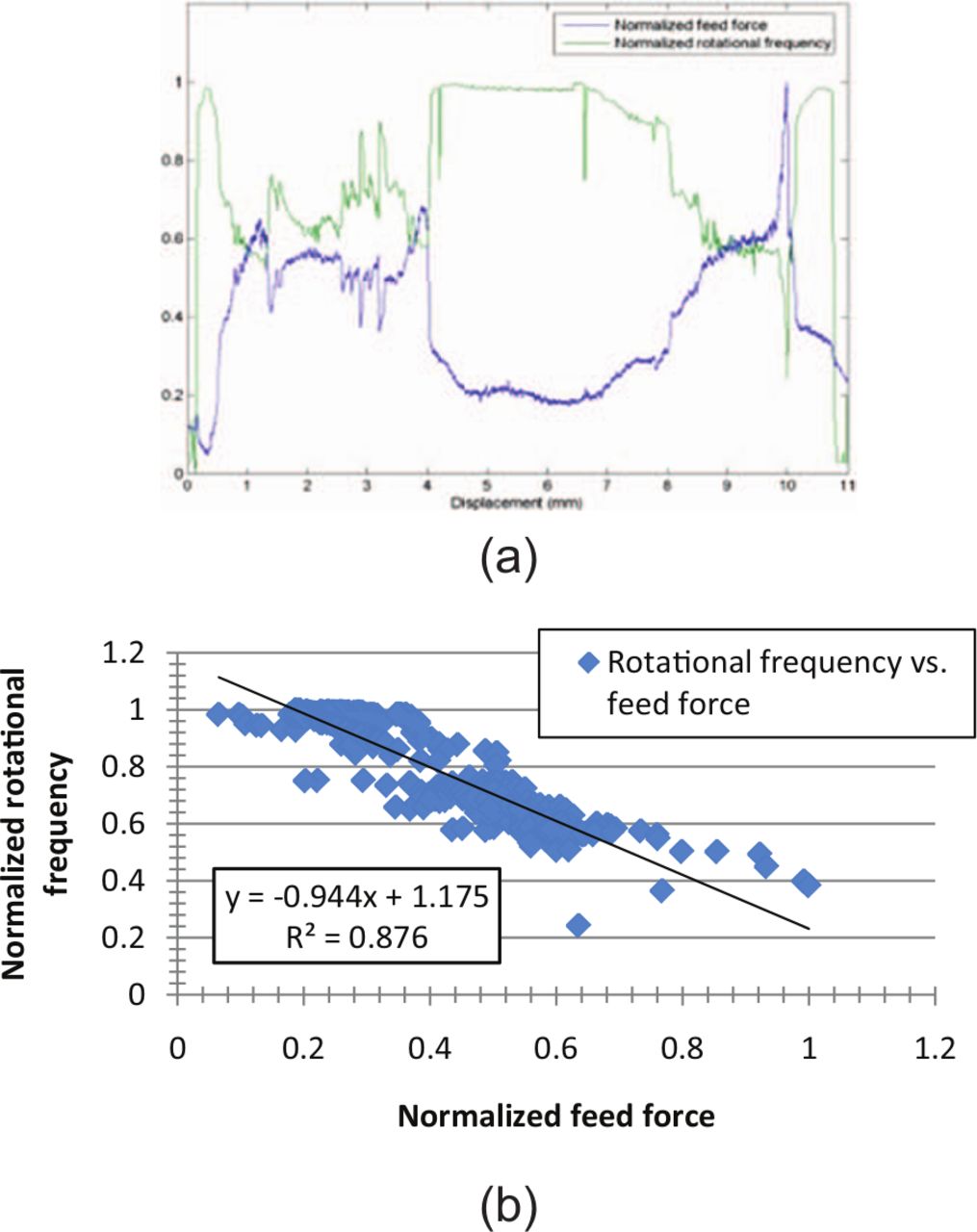 (a) Feed force and rotational frequency versus bur displacement and (b) feed force versus rotational frequency.