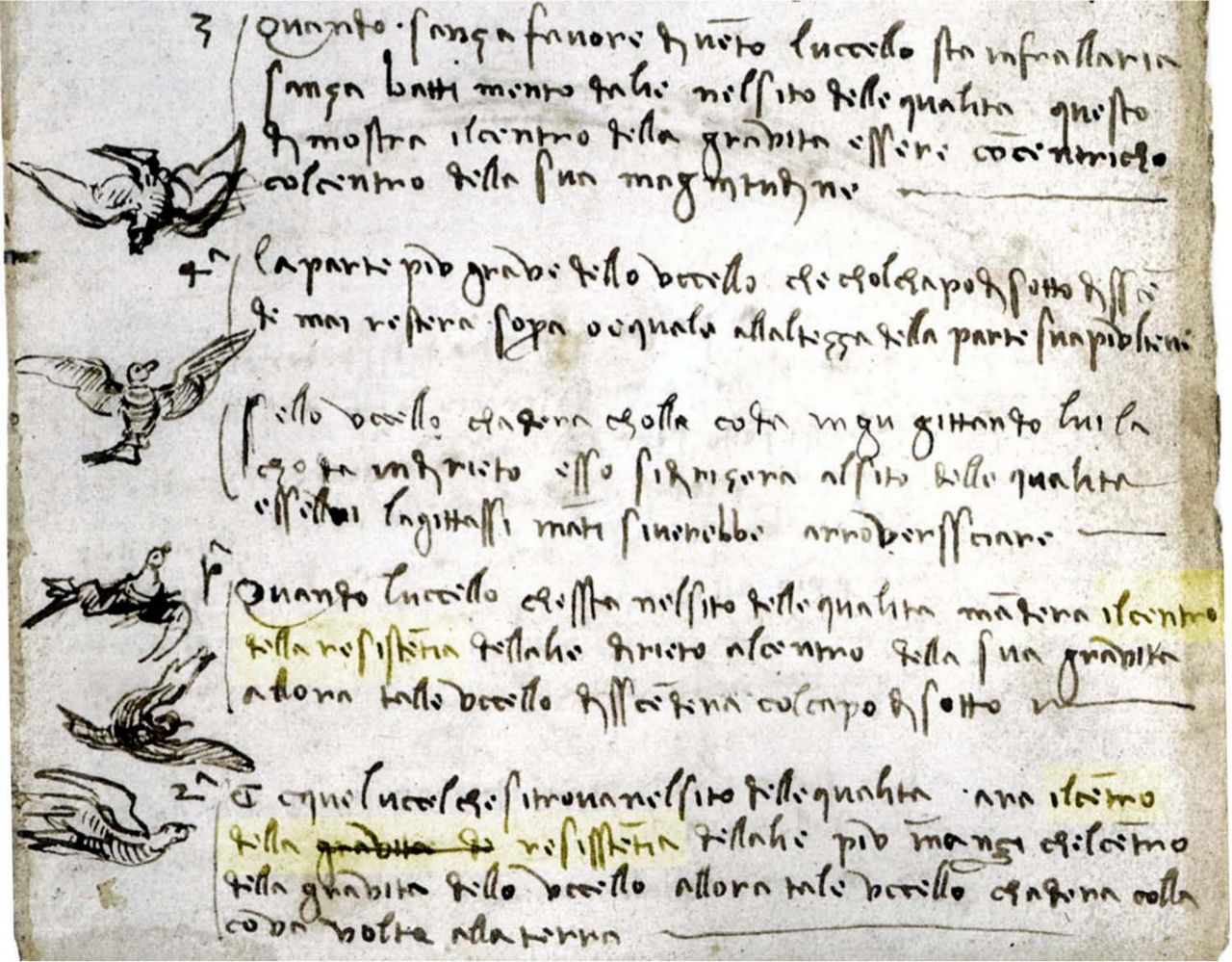 A reflected cutout from Leonardo da Vinci’s Codice sul volo degli uccelli. The concept ilcentro della resistentia is highlighted. The restored manuscript is stored in the Biblioteca Reale di Torino.