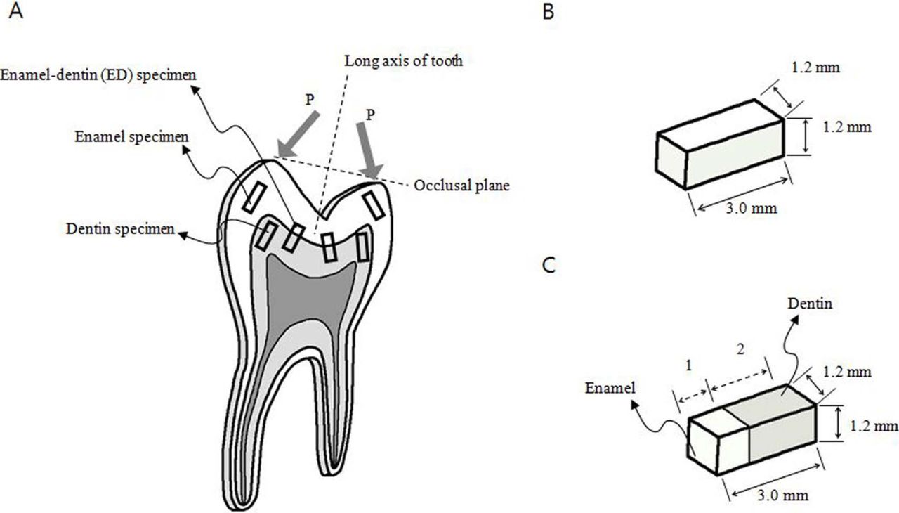Specimen preparation: (a) cross-sectioned after fixing a tooth within epoxy resin, (b) dimensions of enamel and dentin specimens, and (c) dimensions of ED specimens.
