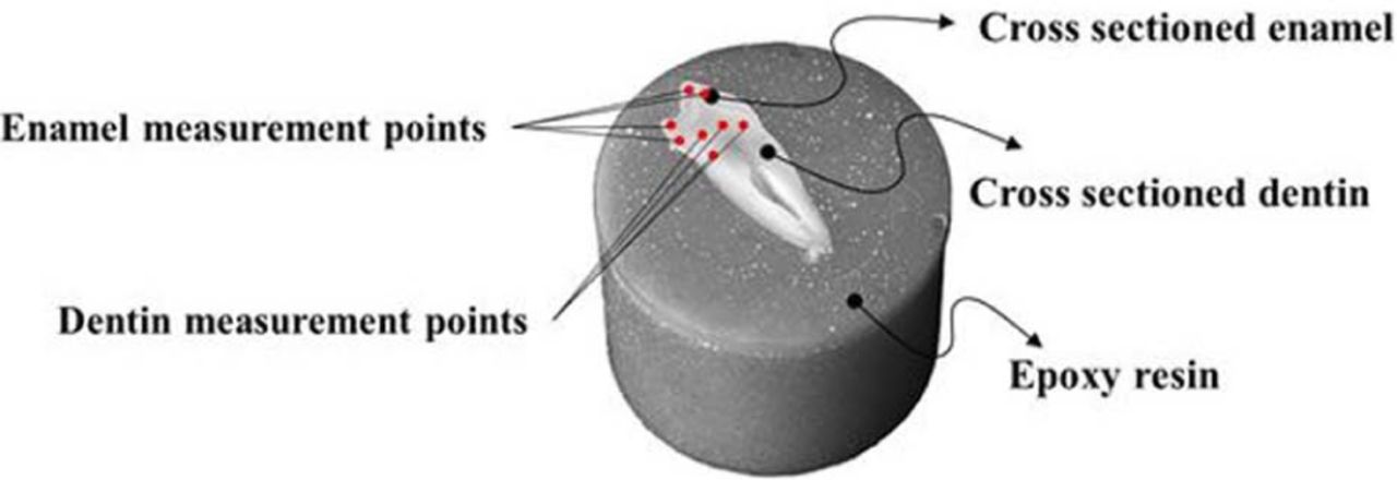 Cross-sectioned tooth specimen in epoxy resin for hardness test with measurement points.
