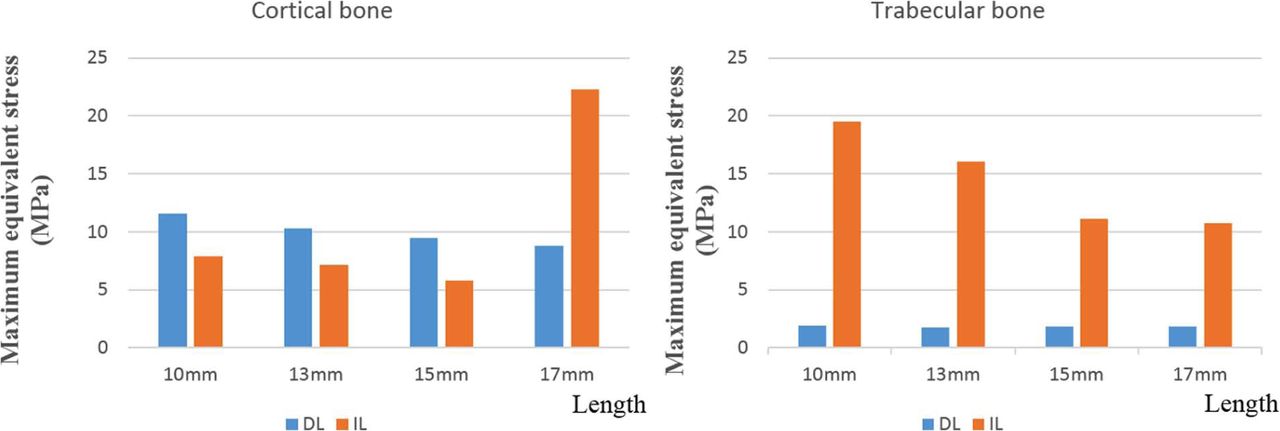 Maximum equivalent stress values around implants of various lengths placed in cortical bone (left panel) or trabecular bone (right panel). Blue columns denote delayed loading, orange columns are immediately loaded implants.