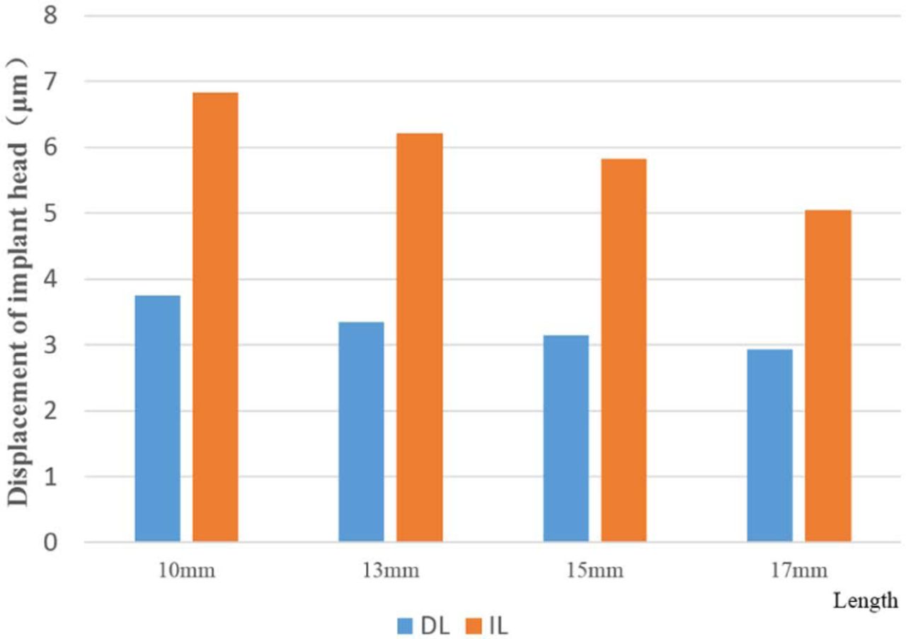 Displacement of the implant head in DL and IL models. Values show average displacement of the implant head under either immediate (orange) or delayed (blue) loadings of various length implants.
