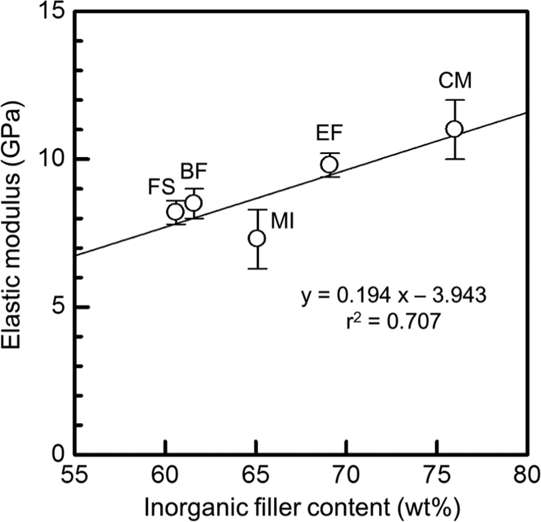 Relationship between the elastic modulus and inorganic-filler content for the five flowable resin composites. The 95% confidence intervals of CM, EF, BF, FS, and MI were 10.1–11.9, 9.5–10.2, 8.1–8.9, 7.8–8.6, and 6.5–8.2 GPa, respectively.