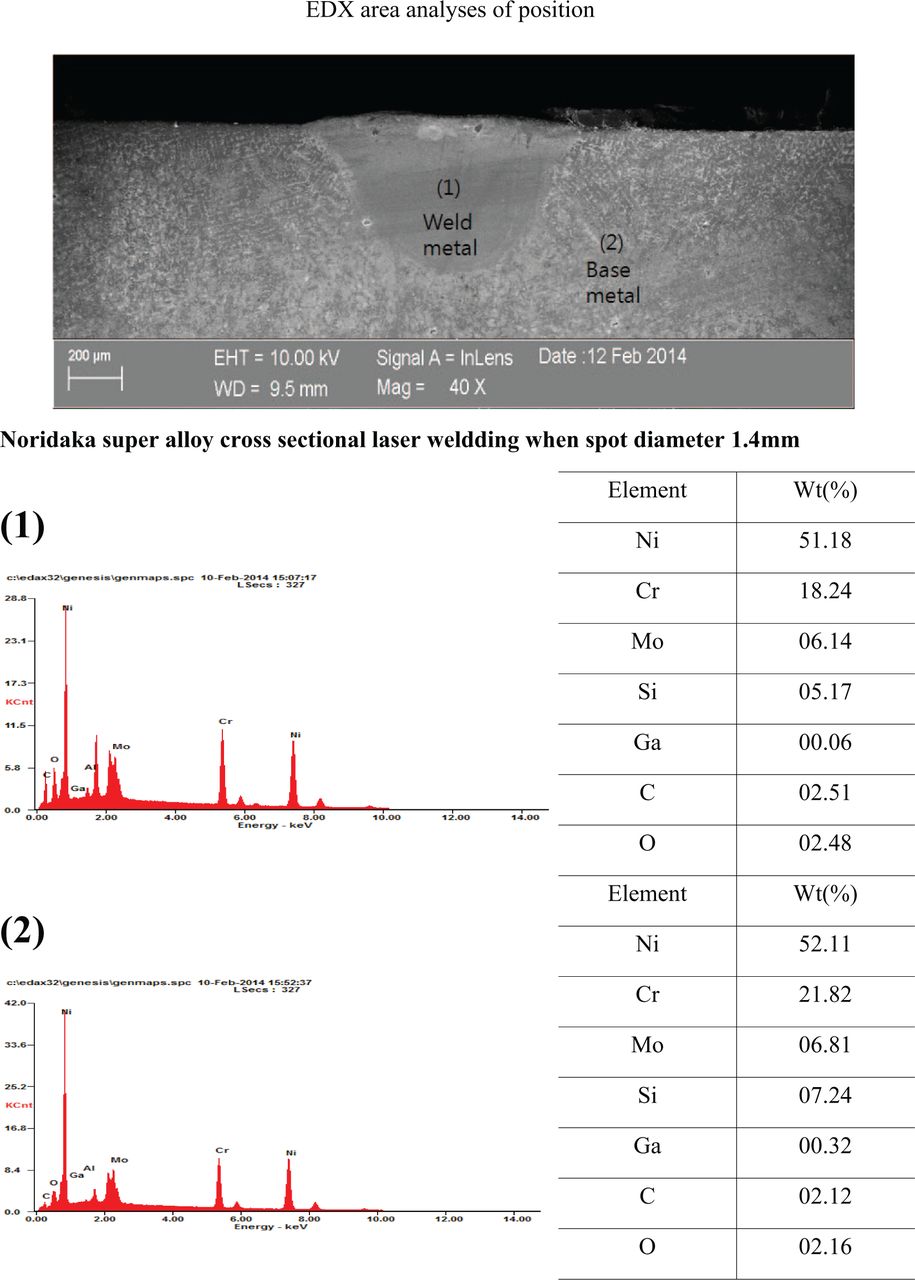 Result of EDS analysis in the matrix area of the fusing zone and base metal.