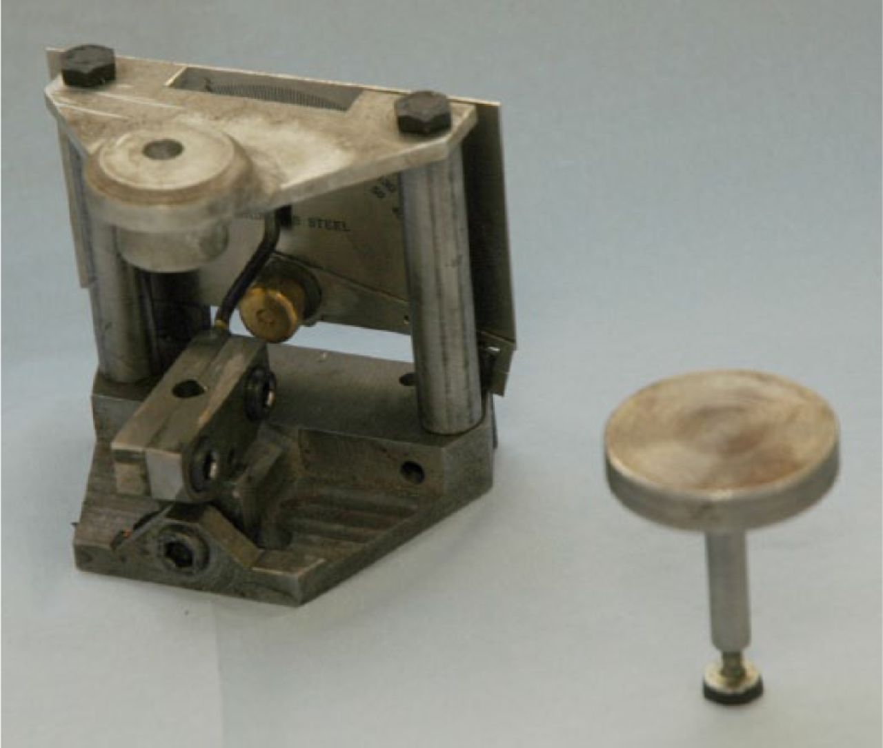 Experimental metallic block with hinge axis, protractor, and horizontal base.