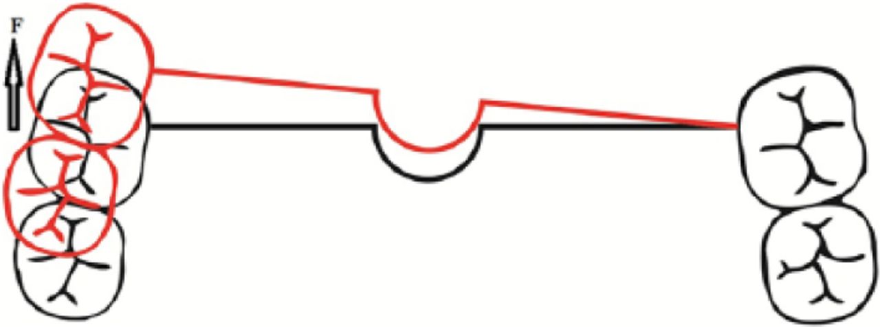 Illustration of a possible anchorage loss phenomenon and how a mesially directed force tends to replace first molars when a transpalatal arch is in place.