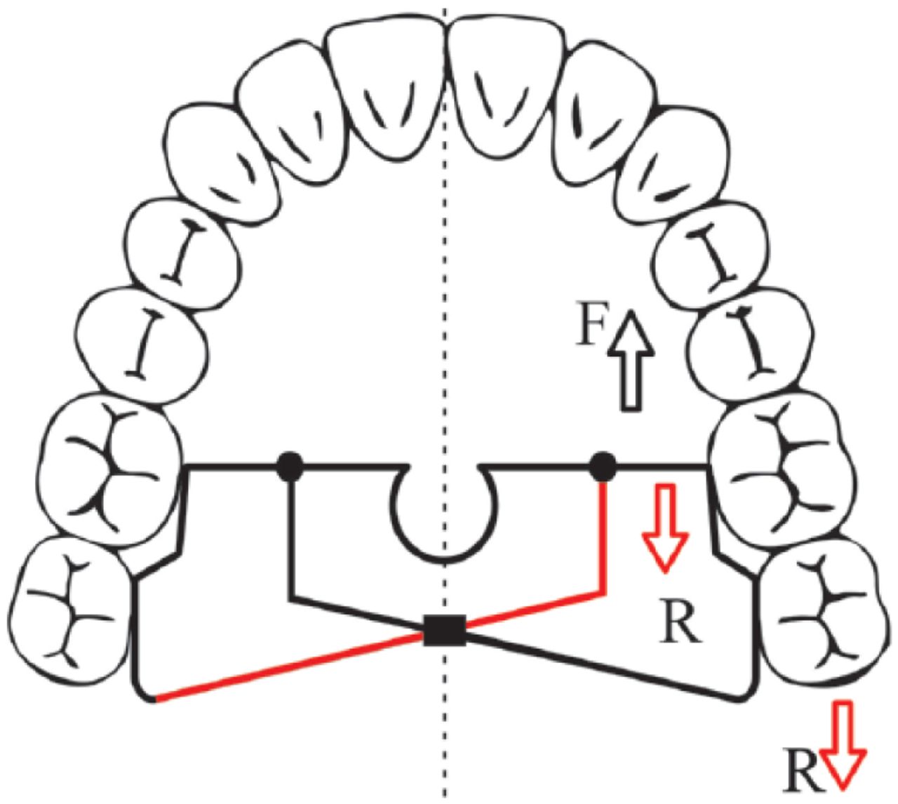 Force system of a butterfly arch when a mesially directed force (F) applies on the left side of the picture dealing with resistance forces (R) of posterior teeth and bracing element (red segment).