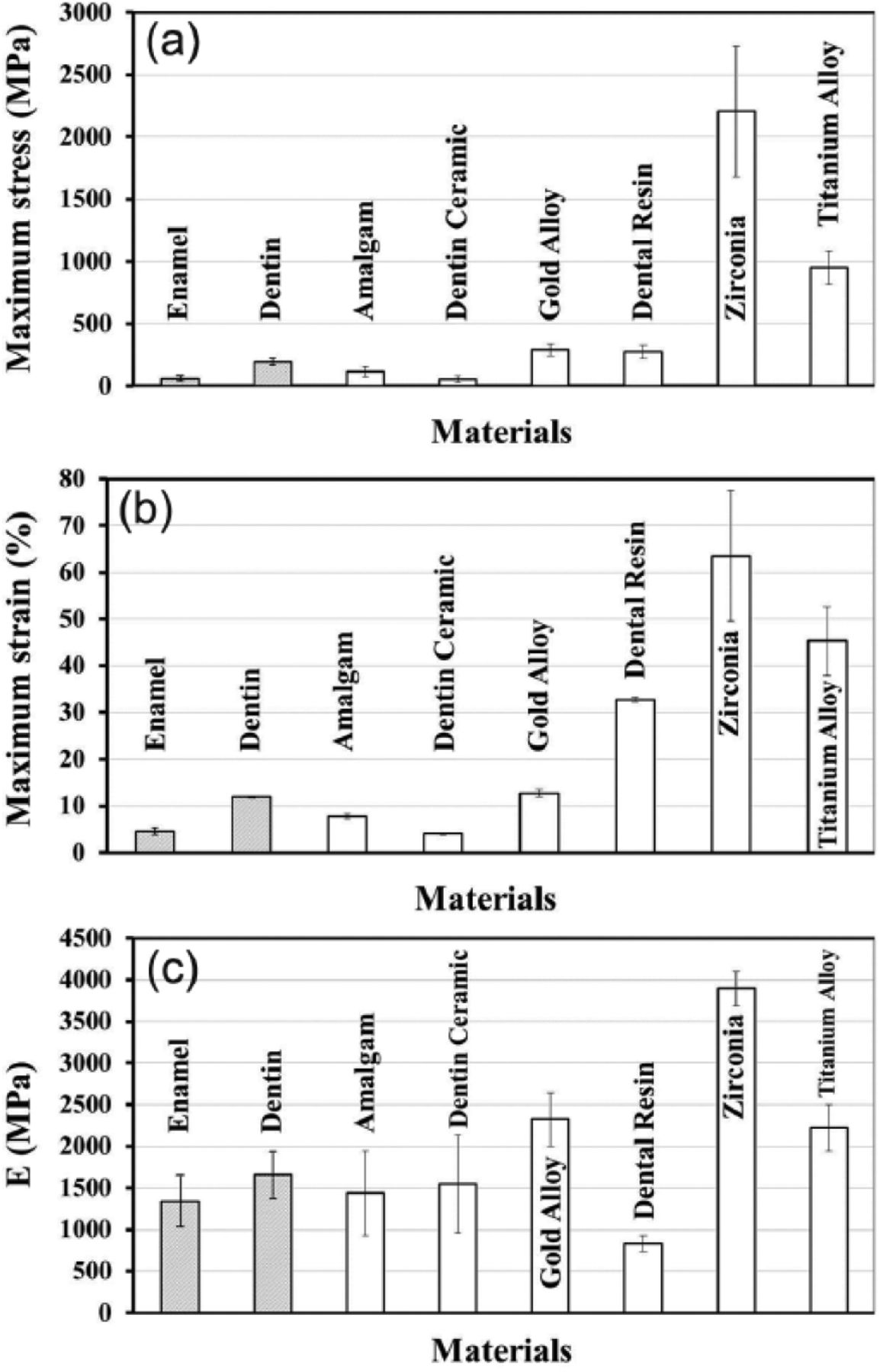 Comparison of (a) maximum stress (MPa), (b) maximum strain (%), and (c) elastic modulus (MPa) of each material from compression tests.