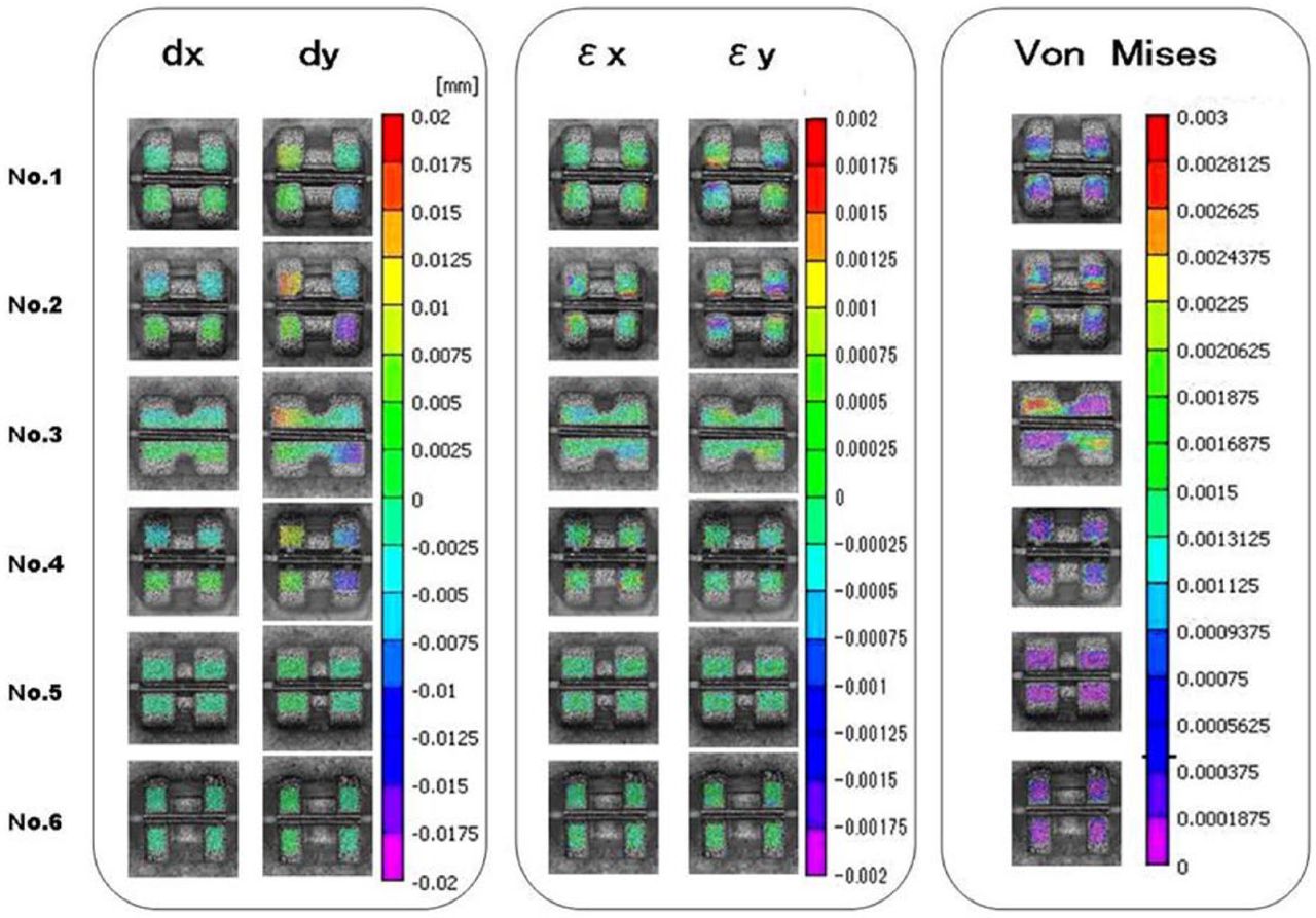 Displacements x- and y-directions, strain, and von Mises strain of each bracket.