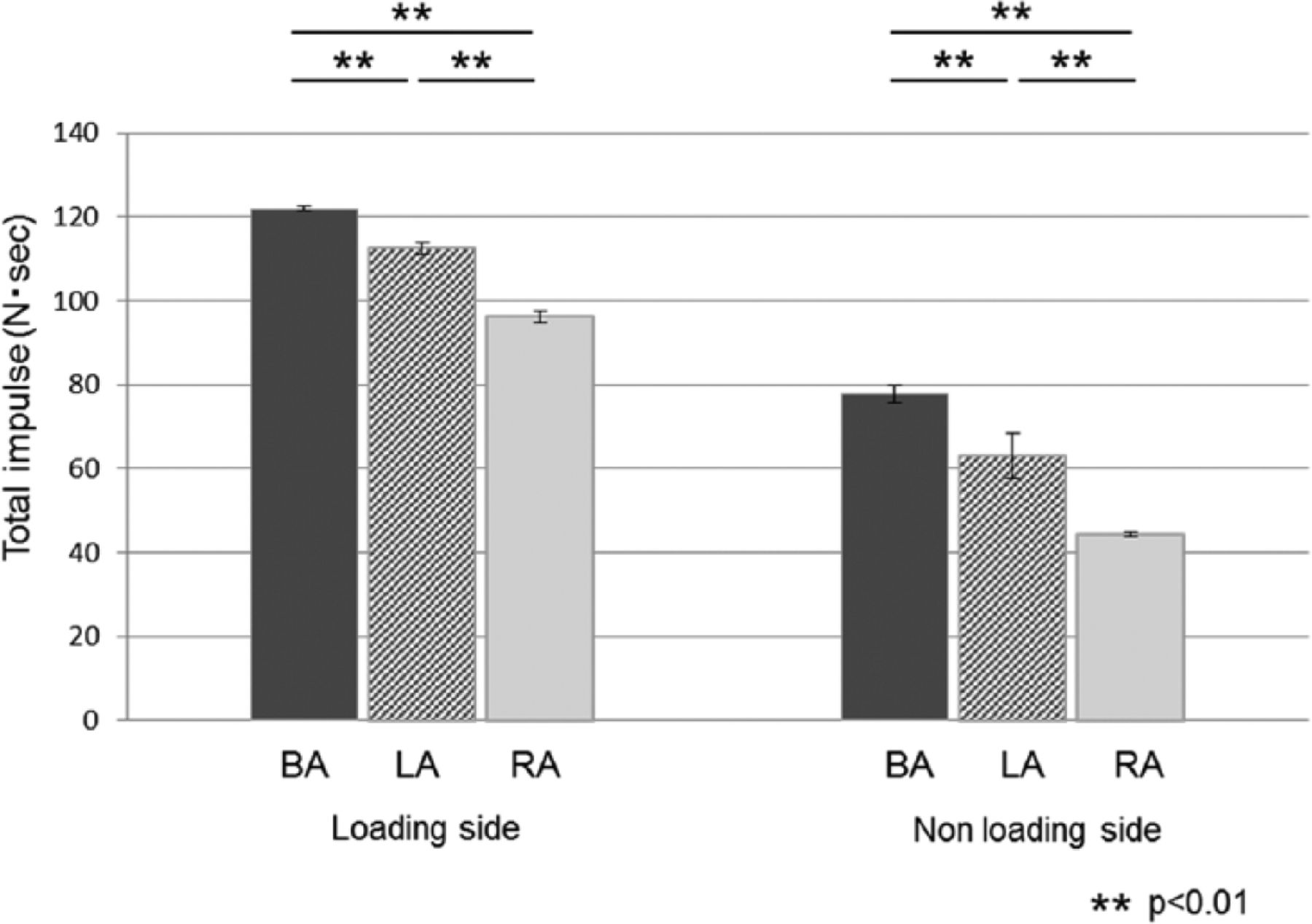Total impulse exerted on each implant while the dynamic repeated load of 100 N was being applied (n = 5).