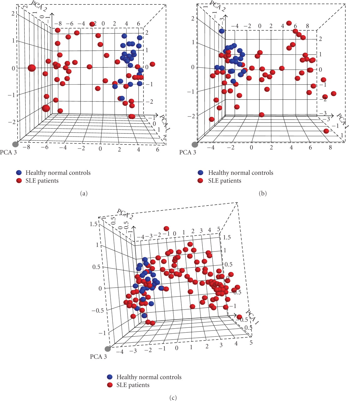 IFN-α/β-inducible genes in WB of SLE patients can be used to separate SLE patients with IFN-α/β-inducible gene signature from healthy normal controls. (a) Three-dimensional PCA plot of WB from 41 SLE patients in the initial study using the 110 upregulated IFN-α/β-inducible transcripts upregulated in WB of SLE patients compared with those from 24 healthy donors. (b) PCA plot of WB from 54 SLE patients in the prospective study using the same 110 upregulated IFN-α/β-inducible transcripts confirmed the overexpression of IFN-α/β-inducible gene signatures in SLE patients. (c) PCA plot of WB from 95 SLE samples in both discovery and prospective study using the 21 upregulated IFN-α/β-inducible gene panel in SLE patients compared with 24 healthy donors. Each point represents one sample (blue points: healthy normal controls; red points: SLE patients). IFN = interferon; PCA = principal components analysis; SLE = systemic lupus erythematosus.