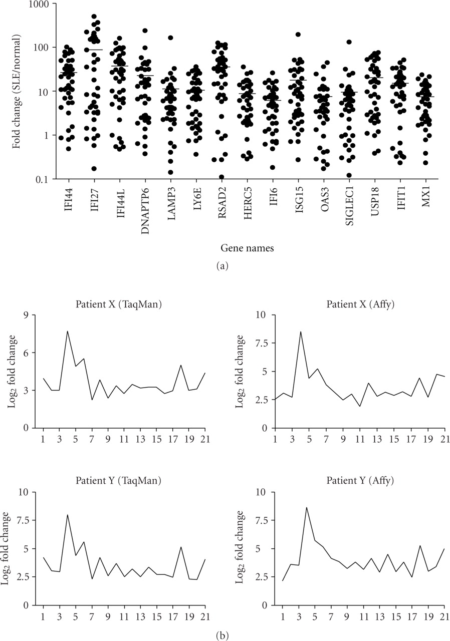 TaqMan QRT-PCR confirmed the overexpression of IFN-α/β-inducible genes in WB of SLE patients. (a) Relative fold changes of