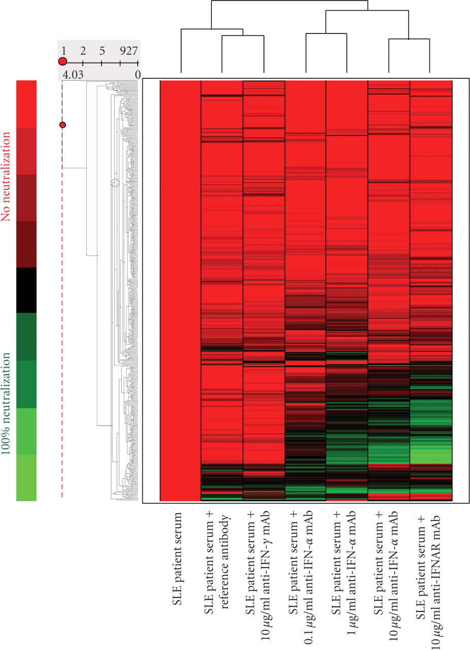 Representative heat map demonstrating anti-IFN-α, -IFNAR, and -IFN-ω mAb effects on healthy donor PBMC stimulated with serum from 1 SLE patient. Lane 1: SLE patient serum only; Lane 2: SLE patient serum plus reference antibody; Lane 3: SLE patient serum plus 10 μg/mL anti-IFN-ω mAb; Lanes 4–6: SLE patient serum plus increasing concentrations of anti-IFN-α mAb (0.1, 1, and 10 μg/mL); Lane 7: SLE patient serum plus 10 μg/mL anti-IFNAR mAb. Color represents relative neutralization (inhibition) of overexpression of individual genes upregulated by soluble mediators in the serum of an SLE patient. The red color represents no neutralization, and green represents neutralization of overexpression of individual genes. IFN = interferon; IFNAR = interferon associated receptor; PBMC = peripheral blood mononuclear cells; SLE = systemic lupus erythematosus.