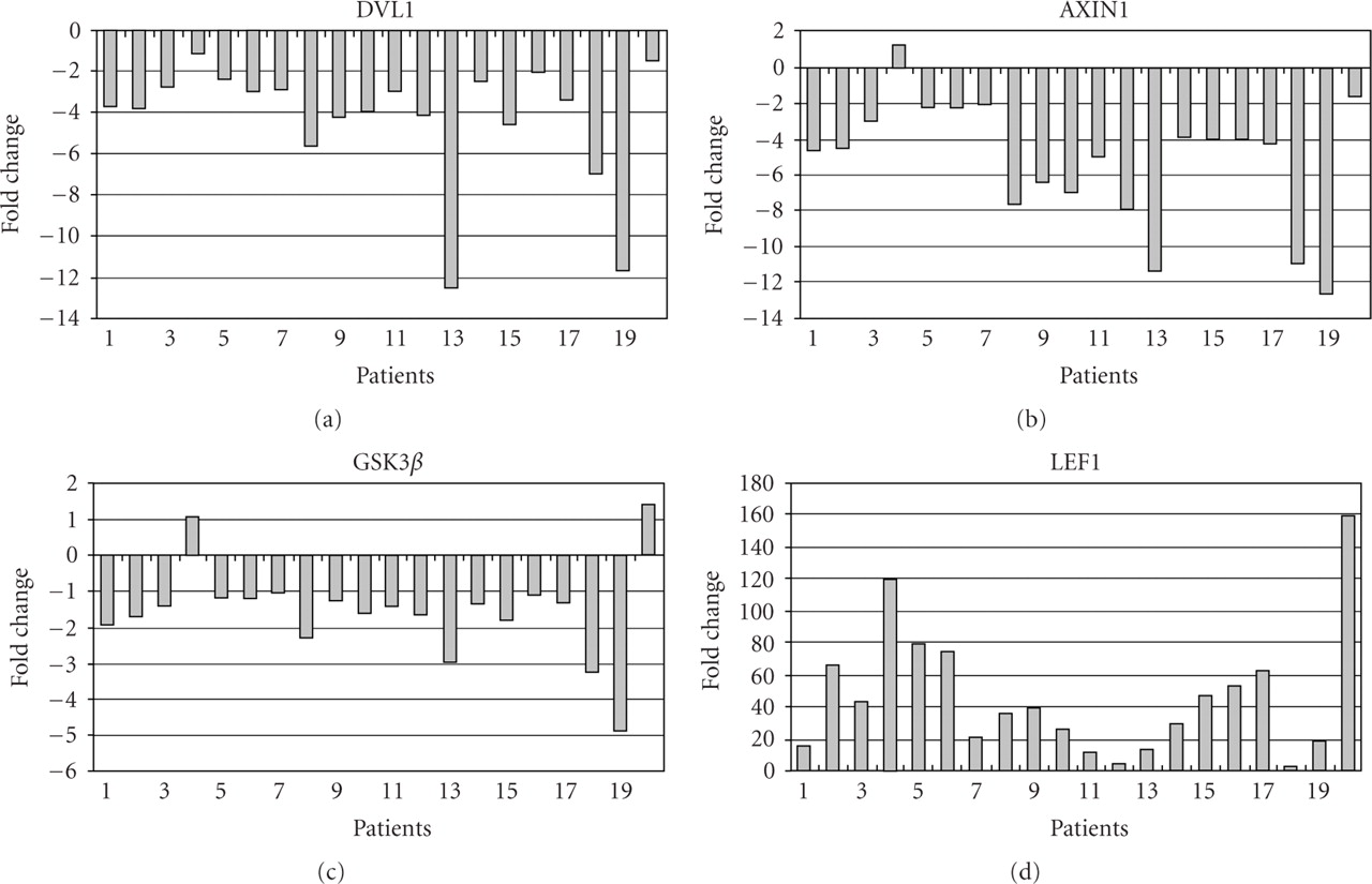 Quantitative real time RT-PCR on 21 low stage CLL patients for selected genes of the WNT/FDZ canonical pathway where key members are down regulated except for LEF-1.