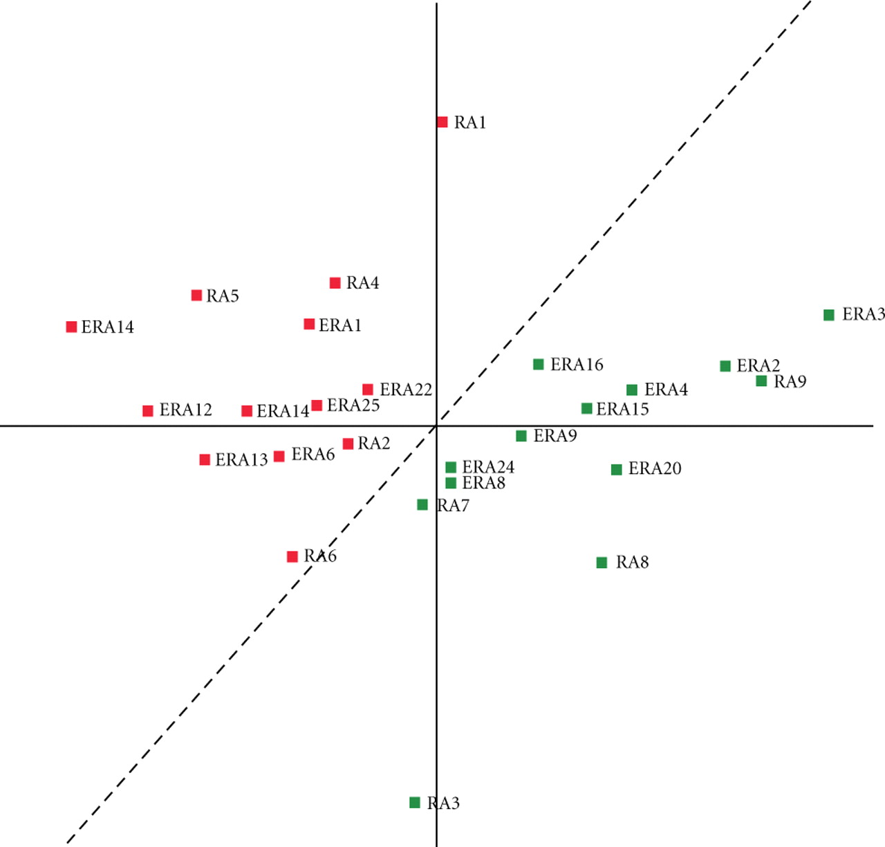 PCA classification of ERA and established RA patients by the 19-gene predictor. Two-dimensional projection of 26 patients