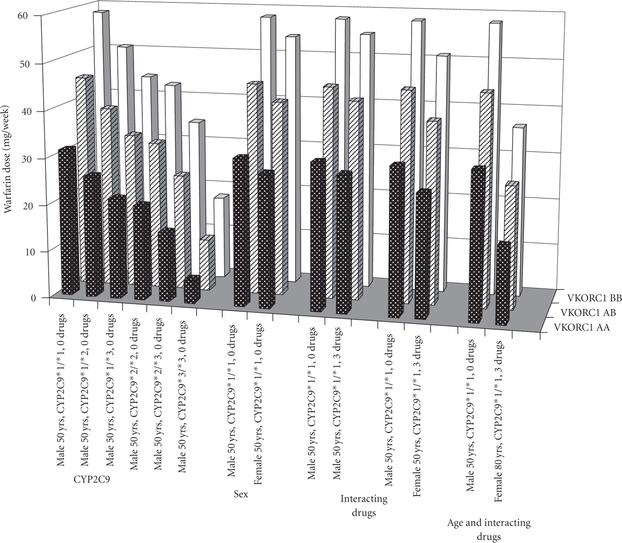 Warfarin dose predictions based on the patient's sex, age, CYP2C9 and VKORC1 genotype, and use of interacting drugs. “Drugs” refer to the number of concomitantly used drugs potentially interacting with warfarin, causing an increased INR (drugs lowering INR are not included in the algorithm).