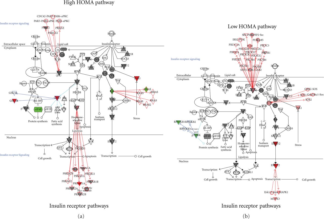 Canonical pathways for the insulin receptor. Protein expression levels for all patients were input into the Ingenuity Pathways Analysis software for analysis of changes in relevant pathways. IPA software has 272 annotated canonical pathways to which it will fit the experimental values of protein expression. Using this analysis function, it is possible to see if (1) the proteins of interest are involved in specific pathways and (2) how the expression levels of those proteins may affect the activity of the pathway. Proteins from our microarray data that are present in the canonical scheme are shaded. If the ratio of patient to control is less than 1.5, the shading of the protein symbol is gray. If the ratio is greater than 1.5, the symbol is red for an increase compared to the control and green for a decrease compared to the control. To limit the pathways to a manageable number, for this analysis, we examined the pathway of insulin action and the pathway of NFκB activation and compared how the two groups of patients differed in their expression levels. The insulin receptor pathway was selected for display.
