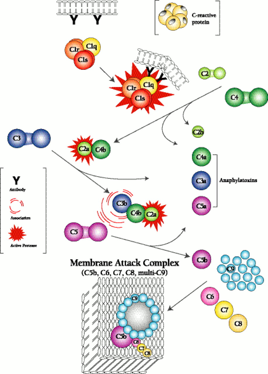 The classical complement system. The nine major complement proteins participate in a series of reactions that involve proteolysis and specific intermolecular associations. Although an immune complex (e.g., antibody bound to the cell membrane of a pathogen, as shown) is the classical instigator of complement activation, C1q can in fact interact with other proteins—some of which are produced in pathological processes—to activate the C1 complex. Many additional factors, such as the C-reactive protein, facilitate the cascade of reactions.