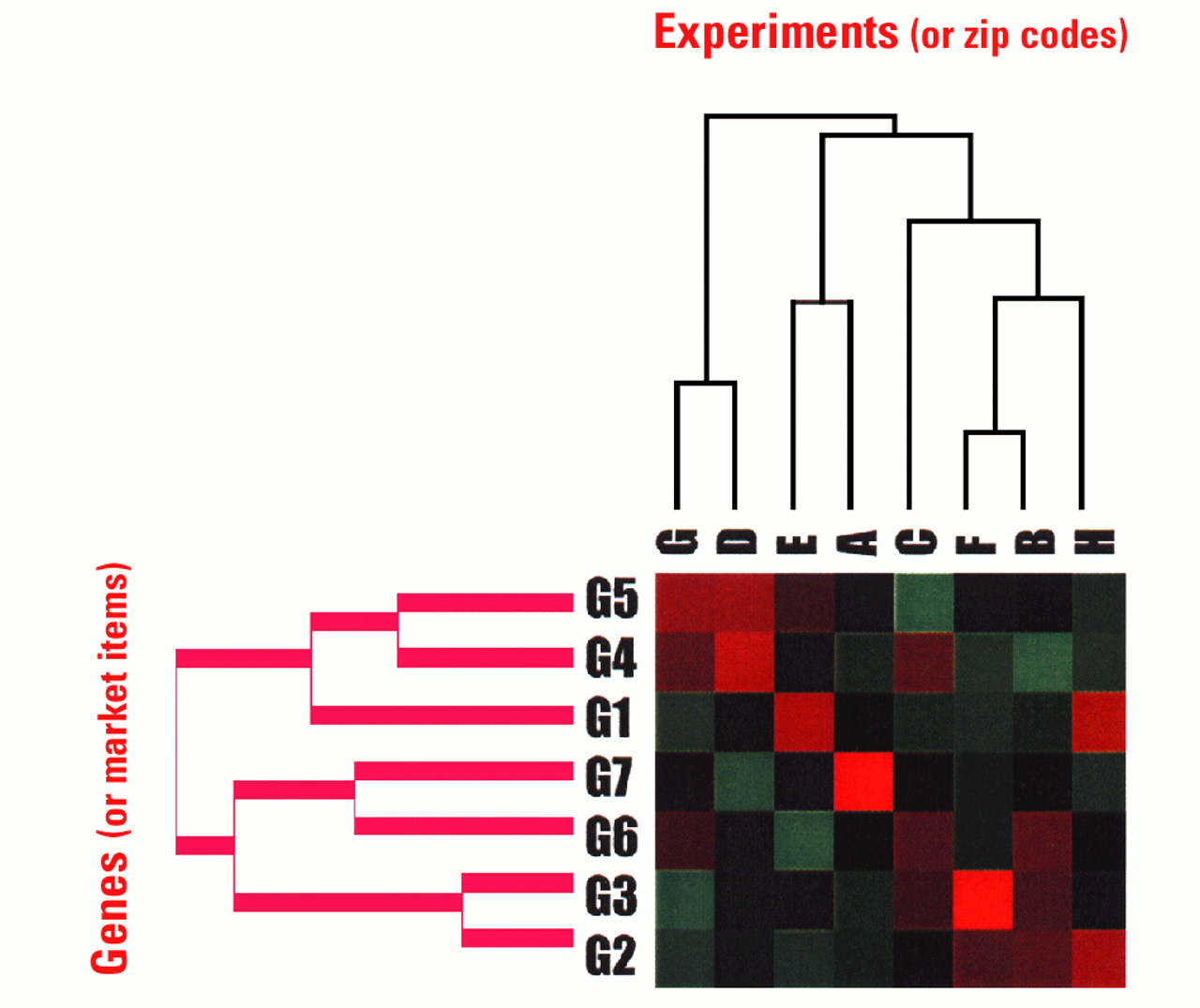 Application of the hierarchical clustering algorithm to genomics and marketing. The origins of the high-quality hierarchical clustering algorithms used for genomic analysis lie in economic analysis. In genomic analysis, patients or experiments are clustered with each other in terms of gene expression. Analogously, customer identifiers, such as zip codes, are associated with purchased items. Optimal associations are formed between nearest neighbors in terms of dyadic branches on a relational tree. We used a random number generator to provide the data example in this figure, and the algorithm provided the array. The graded red and green colors, customary in genomic analysis, represent positive and negative extremes. For example, note the clustering of experiments F and B with respect to their similar sets of colors, and their separation from the disparate color sets of experiments G and D.