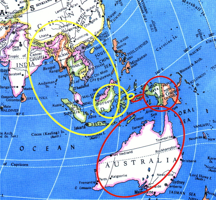 Geographical map explaining the weakness of the hierarchical clustering algorithm. Two small islands in the South Pacific (small red and yellow circles) are close together. When grouped with nearby landmasses, however, one of the islands becomes grouped with Borneo, whereas the other is grouped with New Guinea. On a larger scale, the red-ringed island becomes grouped with Australia, whereas the yellow-ringed island becomes grouped with Asia. Thus, the algorithm can map two entities that are in reality quite close as being distal to one another. On the other hand, when the algorithm describes two entities as being proximal to each other, the description is generally very reliable.