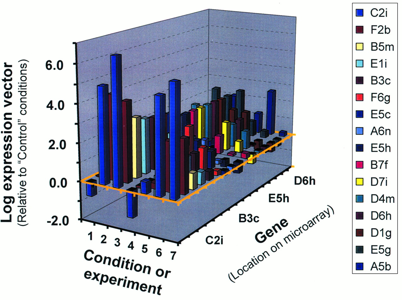Seven-dimensional analysis of genes identified as CF-relevant by the GENESAVER algorithm. Only 16 genes are shown out of thousands of possibilities. The vectors are then compared to the magnitude and direction of