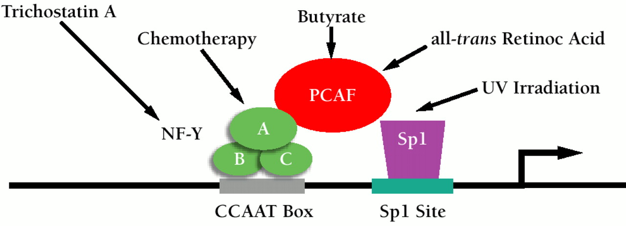 Schematic of the MDR1 enhanceosome, which includes the transcription factors NF-Y, Sp1, and PCAF.