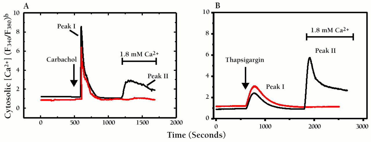 A. Cells (in Ca2+-free medium) actively respond to the cholinergic agonist carbachol (100 μM) by releasing internal stores of Ca2+ into the cytosol (Peak I). Subsequently supplied external Ca2+ is taken up by the cells in the absence (black trace; Peak II) but not in the presence (red trace) of Gd3+ (1 μM). Gd3+ is thus an inhibitor of capacitative calcium entry.