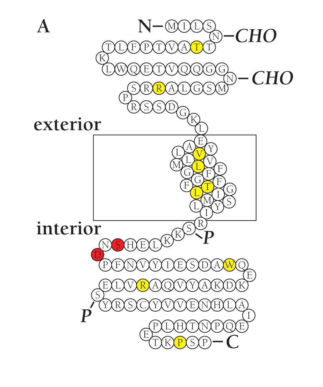 A. Schematic of the MinK peptide indicating disease-associated mutations. Residues highlighted in red represent missense mutations (i.e., S74L and D76N) that have been functionally characterized and clinically associated with arrhythmia (see text for details; also see panel B); residues highlighted in yellow represent mutations that occur in individuals with arrhythmia but that have not been functionally characterized (CHO, predicted sites of glycosylation; P, predicted sites of phosphorylation).