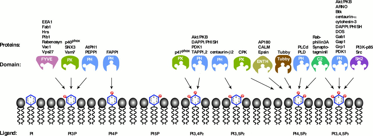 Phosphoinositide recognition domains. Signaling domains that have been demonstrated to bind phosphoinositides are shown as colored shapes with a schematized binding site. Arrows indicate the preferred ligand of the given signaling domain, and proteins that contain the given signaling domain are listed above each corresponding colored shape.
