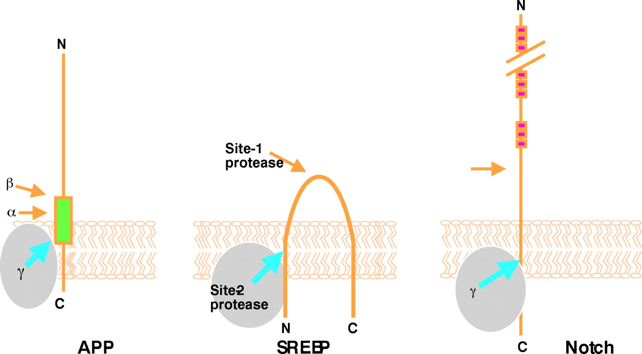 Processing of the APP, SREBP, and Notch. All three integral membrane proteins are proteolytically processed by at least two proteases. Intramembrane cleavage is a